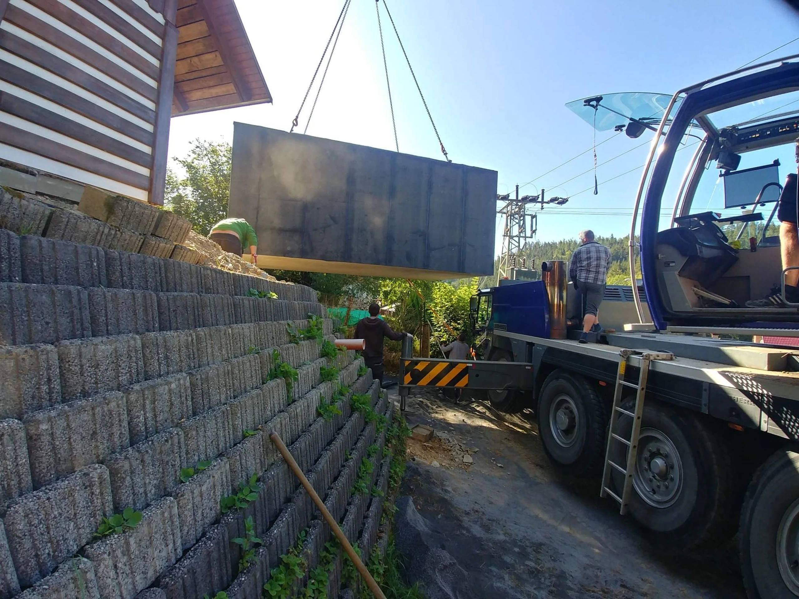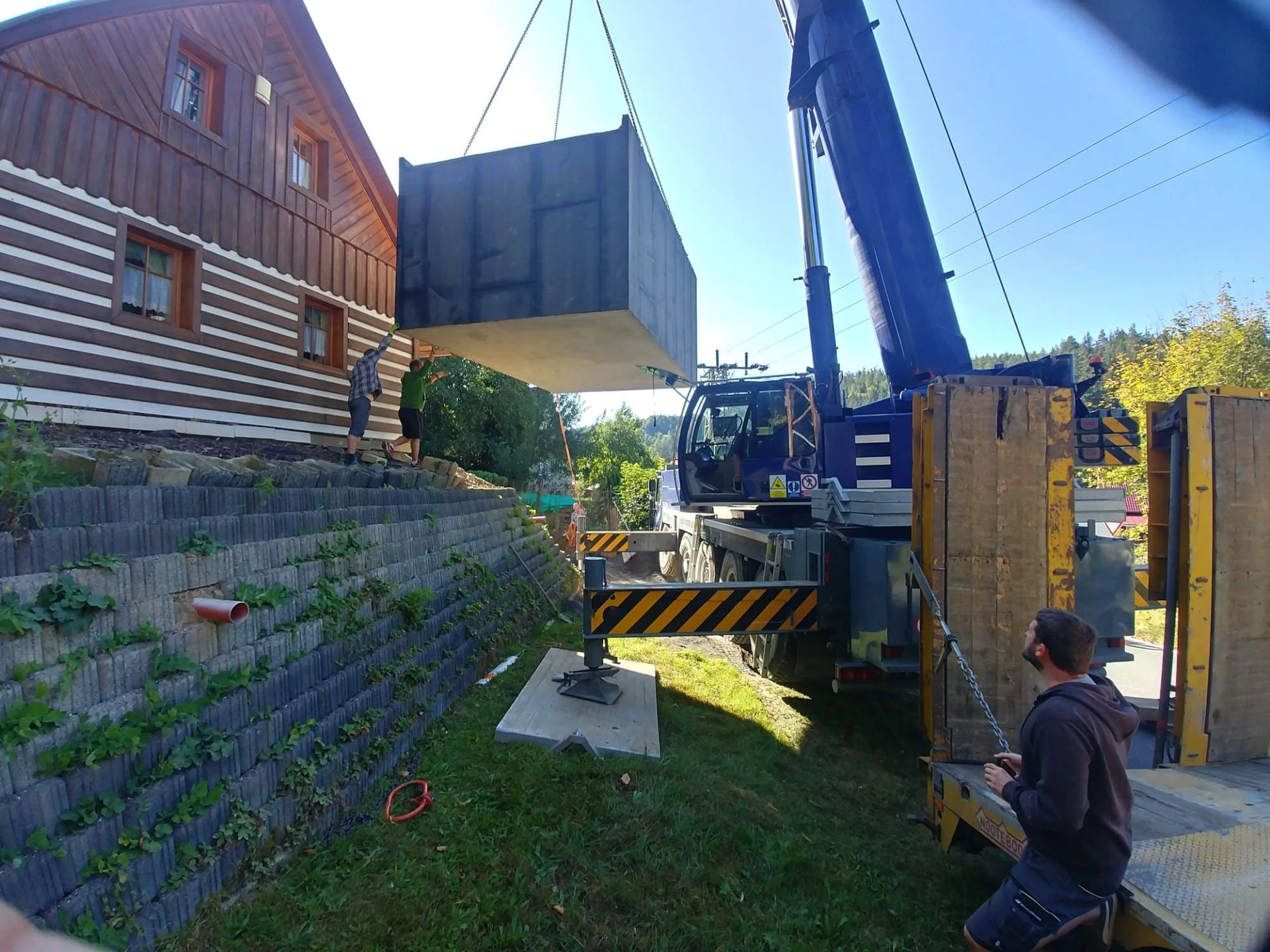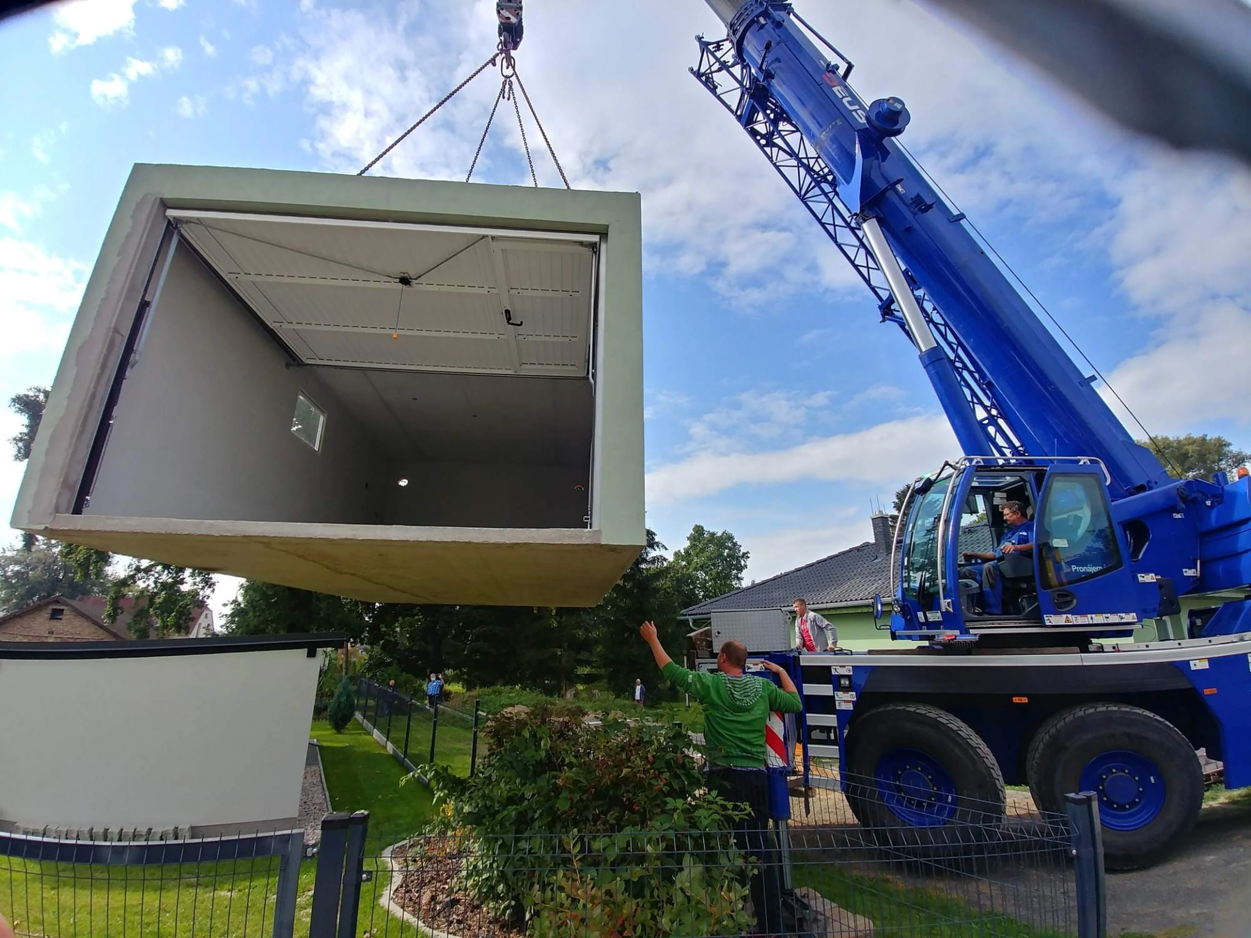 Součástí standardu jsou kvalitní výklopná vrata Hörmann, odvětrávání, možnost elektroinstalace, ale i různé varianty hydroizolace, omítek nebo střech – třeba zapuštěné řešení do svahu se zelenou střechou. Zajistíme také jeřábnické práce, základovou přípravu i montáž, takže se o nic dalšího nemusíte starat.